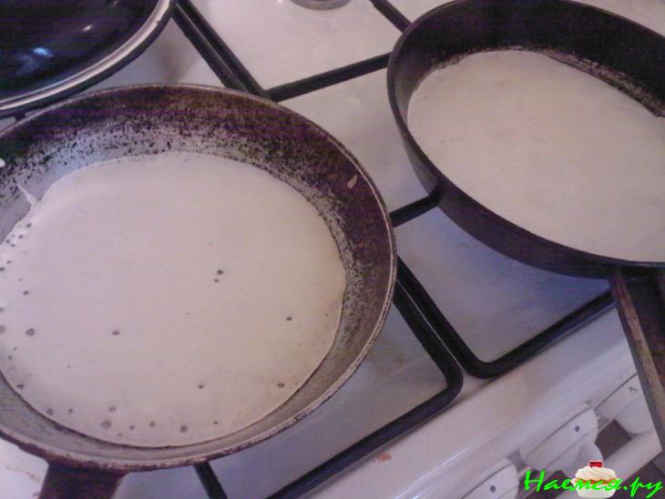 Сковородку прокалить с солью. Вытереть, налить растительное масло (наливаем только под первый блин, больше не нужно).