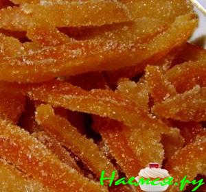Режем кожуру на небольшие и тонкие полоски кладем их в холодную воду,чтобы она только покрывала их, и варим их примерно 20мин.Сливаем воду и повторяем процесс 5 раз.Благодаря этому наши корочки станут намного меньше горчить.