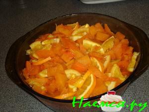 Тыкву очистить порезать на кубики,кружочки апельсина на 6 долек.