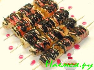 После того как шашлычки остынут, а остывают они очень быстро, выложить на красивое блюдо и посыпать сахарной пудрой.