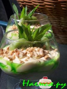 Слой №1 дыня +орехи+грейпфрут +посыпать базиликом,слой №2 залить творожной массой.Слой №3 Грейпфрут+дыня+орехи+базилик,опять полили творожно-йогуртовой массой.Последний слой дыня+орехи+грейпфрут+творожно-йогуртовая масса +посыпать орехами и украсить базиликом.