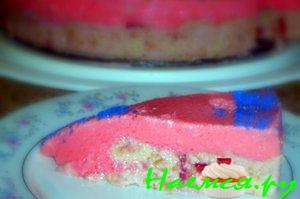 (если с желе,то подогреть замоченое желе в кофе,в микроволновке 20секунд,сливки взбить,смешать с йогуртом и кусочками шоколада,добавить желе и перемешать,и также вылить в форму)