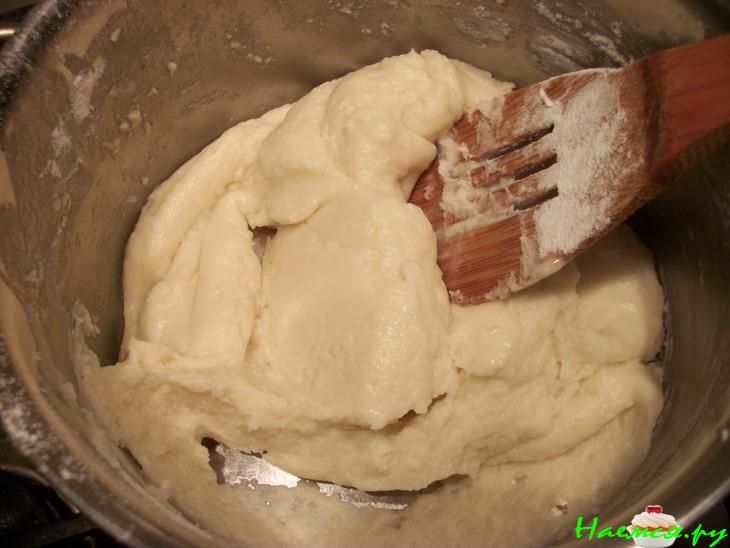 Наливаем в кастрюлю 200 мл воды, добавляем масло, сахар и щепотку соли. Как только вода начнет кипеть, снимаем с огня и вводим хорошо просеянную муку, быстро перемешиваем, чтобы избежать образования комочков.