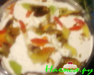 Слой мороженого,слой нектарина,затем слой мороженого,слой киви,слой мороженого,слой винограда,слой мороженого,слой орехов,слой мороженого,весь верх посыпать тёртым шоколадом