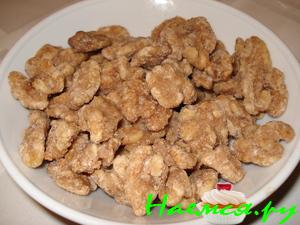 Можно их уваривать ещё дольше, пока сахар не загустеет, затем выкладываем всю массу на пек.бумагу, раскидываем орешки по одному, и даём пол часика просохнуть.