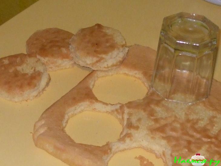 БИСКВИТ: Желтки c горячей водой взбить в пену. Белки взбить с 1 ст.л. сахара в пену. Оставшийся сахар добавить в желтки и взбить до растворения. Смешать желтки с белками. Всыпать муку, ванилин, разрыхлитель и крахмал, перемешать миксером до однородности. Вылить на противень, застеленный бумагой. Печь 20-25 минут при 160 гр. Выложить на стол, снять бумагу. Дать остыть. Стаканом вырезать кружочки.