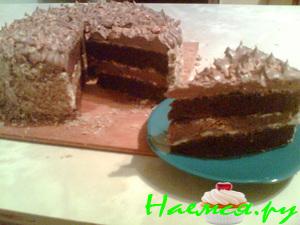 От общего количества муки отложить 2 ст.л. Взбить 3 яйца с 70 г сахара, добавить небольшое количество воды или молока, муку (без 2х ложек), перемешать. Выпечь три тонких коржа при температуре 180-200 градусов.