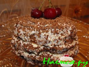 - Сверху покрываете шоколадом или глазурью и присыпаете измельченным орехом. Можно не дожидаться пропитывания коржей и сразу отведать кусочек.