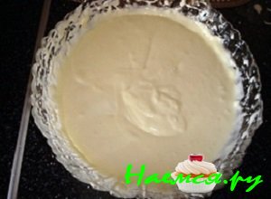 Отправить форму в заранее прогретую духовку. На нижний уровень установить неглубокий поддон с водой (получиться что-то вроде водяной бани). Выпекать чизкейк около часа.