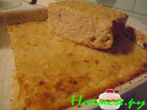 Форму смазать маслом,обсыпать сухарями, выложить массу, верх закрыть промасленной бумагой.