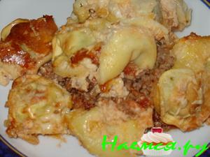 Томаты порезать на четыре части,лук кольцами,чеснок мелко порубить.Сметану смешать с сыром (100гр)Всё окуратно смешать с тортеллини,добавить тунец и ещё раз перемешать и засыпать оставшимся сыром.В духовку на 20 минут
