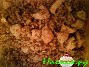 гречку и рис перебрать,промыть и отправить к мясу и овощам,залить 5-ю стаканами горячей воды.
