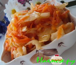 Капусту и морковь тонко шинкуют, перемешивают с мелко рубленным чесноком и укладывают в банки, заливают горячим маринадом. После остывания переносят в холодное место. Маринад:для заливки воду со специями доводят до кипения, вливают уксус и растительное масло.