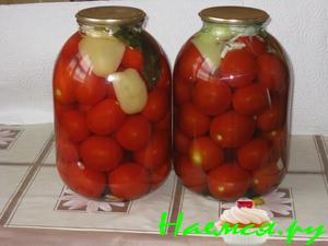 В простерилизованную 3-х литровую банку уложить помидоры. Залить помидоры кипятком. Вскипятить заливку - вода, соль сахар. Как заливка закипела слить из банки воду. Поверх помидорок положить чеснок и залить кипящей заливкой. Закатать, перевернуть, укутать.