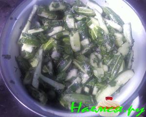 Моем и режем на четыре части огурцы.Трем морковку на корейской терке и добавляем к огурцам. Давим и добавляем чеснок.Добавляем все остальные ингредиенты и оставляем на 40мин. настоятся,периодически помешивая.