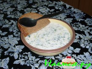 2) Мелко нарезанный огурчик, зубчик чеснока, укроп, столовая ложка растительного масла и соль добавляем к кефиру. Тщательно перемешиваем. Холодный и полезный суп готов!