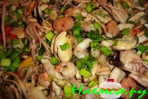 3) Добавьте морепродукты и жарьте не более 2-х мин.