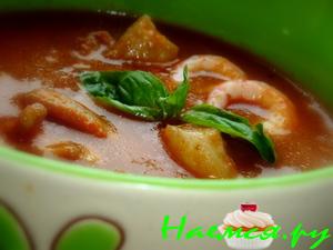 измельченный чеснок и много лука порезанного тоненькими полукольцами. Затем с томатов снять кожицу, измельчить их смешать с томатным соком в котором они находились и влить в кастрюлю. После закипания положить креветки и порезанную кусочками рыбу. По вкусу добавить соль, перец, немного сахара и итальянские травы. Супчик должен получиться густым.