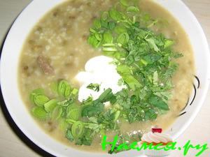 Готовый суп снять с огня, дать немного постоять, не открывая крышки, затем разлить в глубокие тарелки, посыпать черным перцем и мелко порезанной кинзой, зеленым луком, базиликом или укропом.