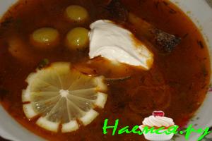 При подаче в каждую тарелку добавляем оливки и сметану.