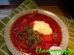 В почти готовый бульон добавляем картошку,порезав ее кубиками,солим,варим до готовности.Затем вливаем жидкость от всей банки маслин,порей(порезанную белую часть)доводим до кипения,добавляем зажарку,отложенные 4ст.л.сырой свеклы,зелень порея,тушенную с уксусом свеклу,чеснок,меленько порезав,маслины(достаточно полбанки),перемешиваем,доводим до кипения,добавляем петрушку,кориандр,лаврик и перчик-горошек.Бывает попадается свекла не достаточно сладкая,тогда нужно добавить чуть сахарку,чтобы не было кисло.Выключаем.Готово.Только пусть настоится минут 10.Подавать со сметаной.Приятного аппетита!