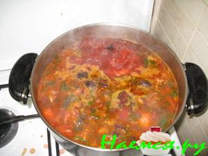 В кипящую воду (я беру 4-5 литровую кастрюлю) бросить картофель варить 5-7 минут, затем капусту - варить еще 5-7 мин. добавить зажарку из сковороды, довести до кипения и варить 2-3 мин, туда же добавить фасоль (предварительно слив с нее сок), выжать чеснок, и добавить рубленную зелень, довести до кипения, снять с огня и дать настояться 1 час.