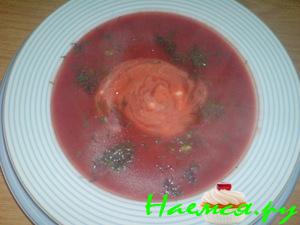 Вынимаем пучок с зеленью – он нам больше не нужен. Бульон можно процедить. Нарезаем свеклу соломкой не очень мелко (незачем крошить сочную печеную) и кладем в суп. Готово.