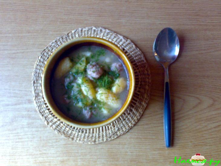 Далее...На 35 минуте варки фасоли в супчик кладем приготовленные из фарша фрикадельки,картофель,даем им повариться 10 минут и кладем наши шишечки, супчик со всеми волшебными дополнениями варим еще 7-10 мин.Солить супчик можно после того,как немного поваратся фрикадельки,тогда же перчим,кладем лавровый лист,головку лука...Чеснок я отправляю ко всей этой честной компании за 1-2 минуты до окончания всего термического процесса...Накрываем наш супчик крышкой и даем ему опомниться и свыкнуться с неизбежным 5 минут, а затем уже можно пробовать и не только...