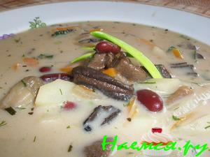 когда фасоль почти готова добавляем картошку и мясо, соль перец (возможно ваши суповые приправы)