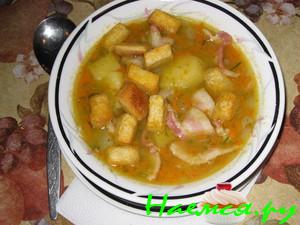 У нас после пасхи остался небольшой кусочек грудинки , ну и решили мы сварить супчик. Итак горох замочить в кипятке на 20-30мин меняя воду по мере остывания. Грудинку режим на небольшие кубики и выжариваем до образования шкварок, затем лук порезанный кубиками небольшими, и обжариваем до золотистого цвета, затем добавим морковку тертую на терке и жарим еще 3-5 минут, зажарка готова.