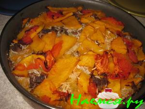 Тыкву и помидоры нарезать ломтиками,