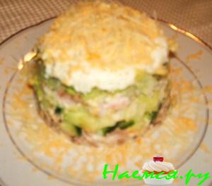Грибы и лук обжареваем,перемешиваем и остужаем.Креветки отвареваем и очищаем.Сыр и огурец натераем на мелкой тёрке.