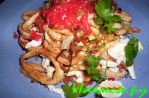 Кальмары очистить,отварить,нарезать мелкой соломкой.