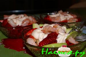 Морепродукты и лук отжать от маринада,добавить авокадо и выложить в креманки,полить соусом и украсить зеленью.