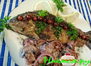 потрошеного карпа или сазана выложить, заполнить брюшко лимонными дольками, укропом с солью и давленым чесночком, посолить сверху и залить сливовым джемом, а лучше протертой сливой с сахаром и солью. Добавить немного масла, фисташки и поставить в духовку до готовности