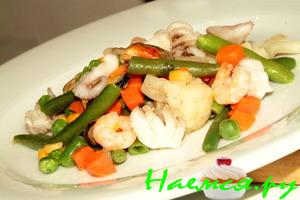 Смешать морепродукты с луковой массой.Добавить мелкопорезанный укроп и перец.