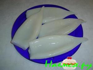 Тушки кальмаров вымыть, удалить внутренности, очистить от пленочки и удалить хрящевую пластинку.Опустить на несколько секунд в кипящую воду,чтобы тушки приняли форму.