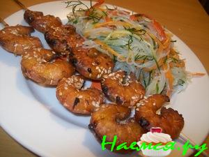 Дожидаемся закипания и соединяем содержимое данной сковороды с содержимым первой, в которой находятся креветки. Перемешиваем, заливаем соусом «Сукияки». Если вас смущает название данного соуса, или его нет в продаже в вашем регионе, то можно воспользоваться любым « китайским кисло-сладким» соусом, но тогда придется добавлять в него острого перца. Держим сковородку на огне минут пять и отставляем. Креветки готовы и ждут!