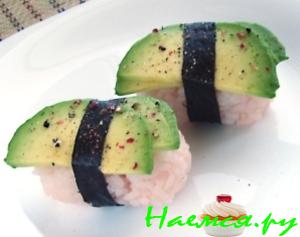 Окуните руки в мисочку с подкисленной уксусом водой и скатайте рис в небольшие шарики (диаметром 3-3,5 см) или колбаски, плотно сжимая их, для лучшего склеивания. Держа шарик (колбаску) "суши" в левой руке, указательным пальцем правой руки положите на него немного васаби, затем ломтики угря и осторожно сожмите в руках, чтобы придать форму. Кусочек рыбного филе, который вы положите на рис, должен быть по размеру немного больше. Можно порезать водоросли nori на длинные полоски (шириной 0,5 см) и обернуть вокруг "суши", скрепляя концы водорослей, намочив водой.