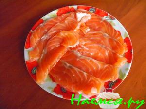 После чего стряхните с рыбы весь маринад, промокните полотенцем и тоненько нарежьте.
