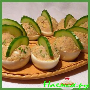Яйца разрезать пополам, аккуратно вынуть желтки, растереть их с печенью трески, добавить майонез и наполнить этим фаршем белки. Украсить зеленью.