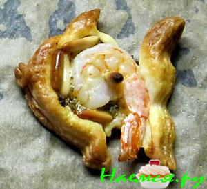 Теперь берем наши креветки и выкладаем их на наши заготовки в форме сердечка.