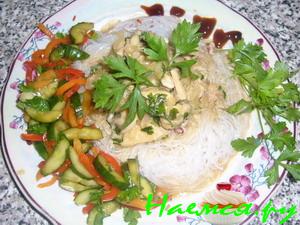 затем в тарелку выкладываем фунчозу,на нее сверху морепродукты и сверху выливаем соус,все готово!