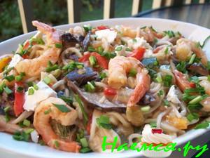 авернуть в листья салата по чуть чуть все овощи+зелень+лапша+креветки и подавать с вашим любимым соусом.