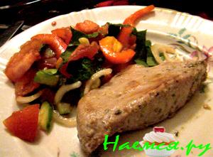 филе нанизить на шпажки чередую дольками лимона и апельсина...