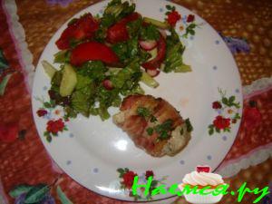 Выложить в огнеупорную форму, посыпать специями, посолить, залить смесью из майонеза и яиц, запечь в духовке минут 10-15.