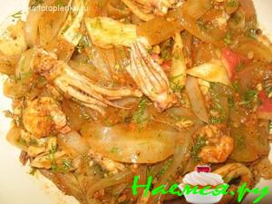 Добавить в масло морепродукты. Обжарить минуты 1,5.
