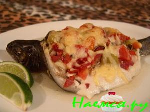 готовую рыбу раскладываем на тарелки, удаляем шпажки и поливаем ветчинным соусом