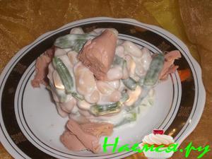 Зелёную фасоль отварить в подсоленой воде 1 мин. и порезать на 2 см. длинной
