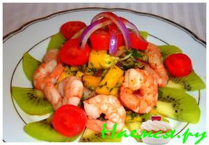 Лук и манго нарезать помельче, зелень мелко порубить, смешать с оливковым маслом и соком лимона, полученной смесью, заправить салат. Сверху украсить креветками и припорошить молотым красным перцем.